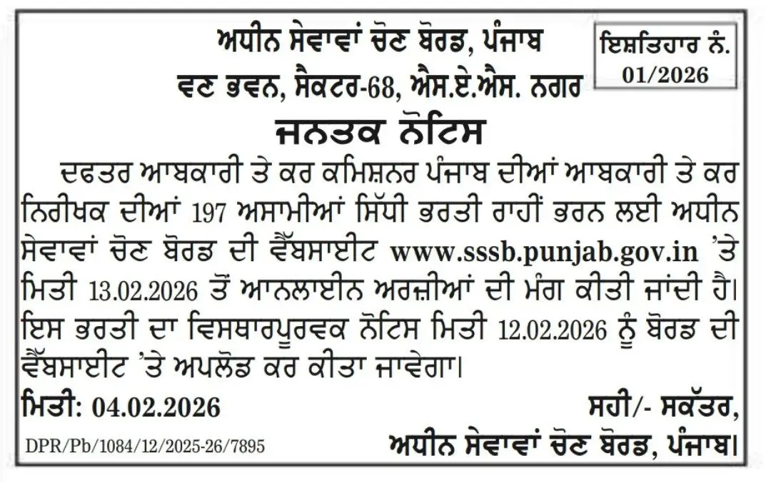 The notification for PSSSB Excise and Taxation Inspector Recruitment 2026 has been released through the employment newspaper, announcing the number of vacancies to be recruited this year and the dates to apply online. Further details for the recruitment will be released on 12th February 2026, with the detailed notification pdf at https://sssb.punjab.gov.in/. Check the short notice attached below.